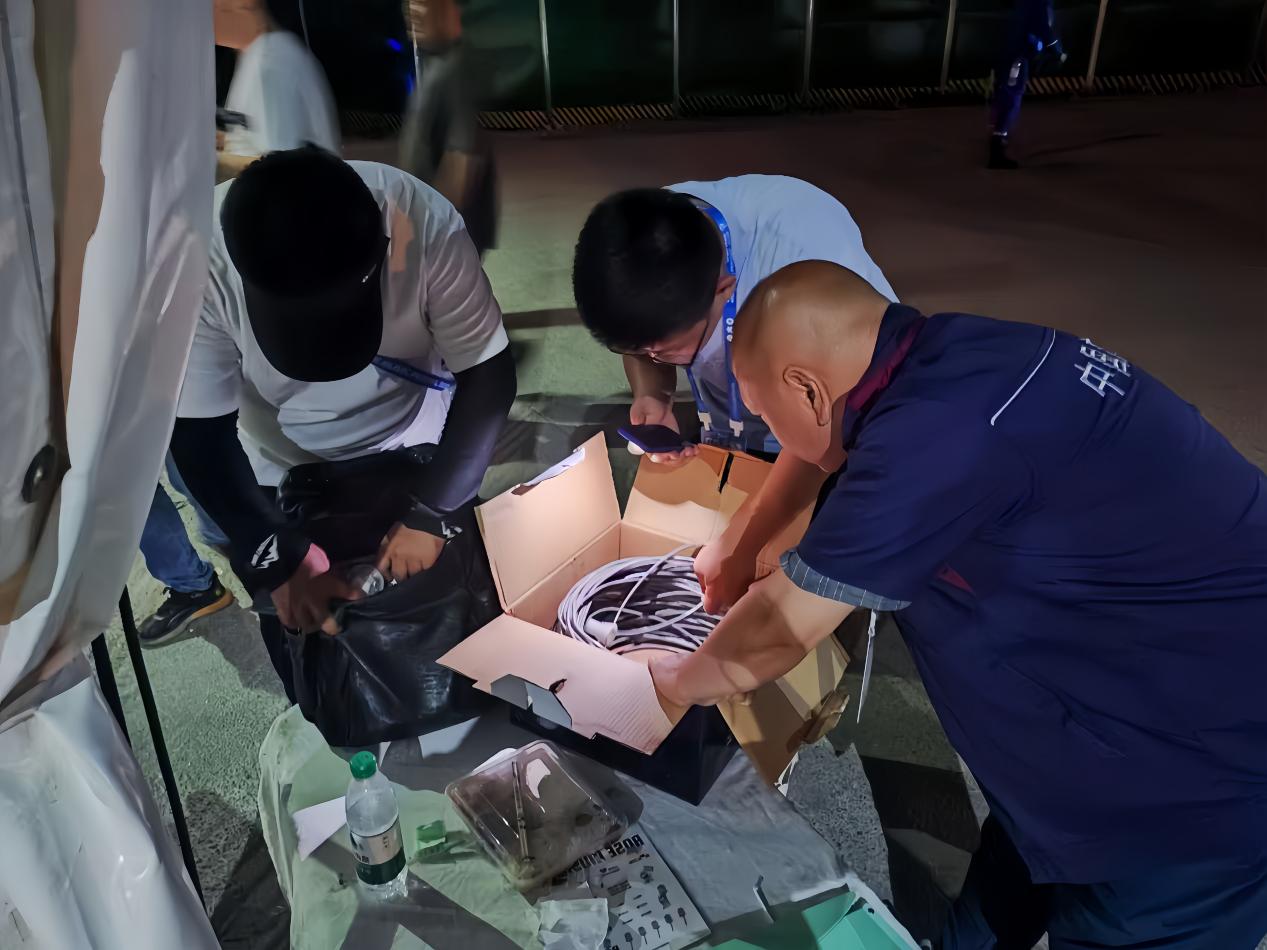 在玫瑰音乐节筹备期,技术小组结合现场环境绘制图纸,细致标出每一个无线AP的位置,按照参数算好覆盖范围,减少重叠区域。此举减少了三成地面施工工程量,节省了近万元成本。为让玫瑰音乐节11处饮品站的设备顺利接入后台监控,确保商户能够实时看到数据情况,他们用“穿管器牵引法”高效布线,推动“万物互联”智慧产品在商户终端处落地落实。为保证观众能够快捷畅通地进入音乐节活动场地,技术小组的工作人员重点保障入口闸机的网络顺畅。“时延0.013s”,他们从检票闸机底部探身而出举着测试仪喊到,并同时对站位及机房开展多轮测试,用“负载均衡和访问控制列表”构筑起网络最后一道安全保障。汗顺着脸颊滴到了工装上,打湿了中国广电LOGO,但却连通了观众进场的道路。首日,和平杯世界足球公园有2万余人陆续入场。当闸机流畅响应、丝滑开关时,他们知道他们的前期辛苦并没有白费,而观众脱口而出的“比奥体中心演唱会还顺”,更是对他们技术能力最好的褒奖。