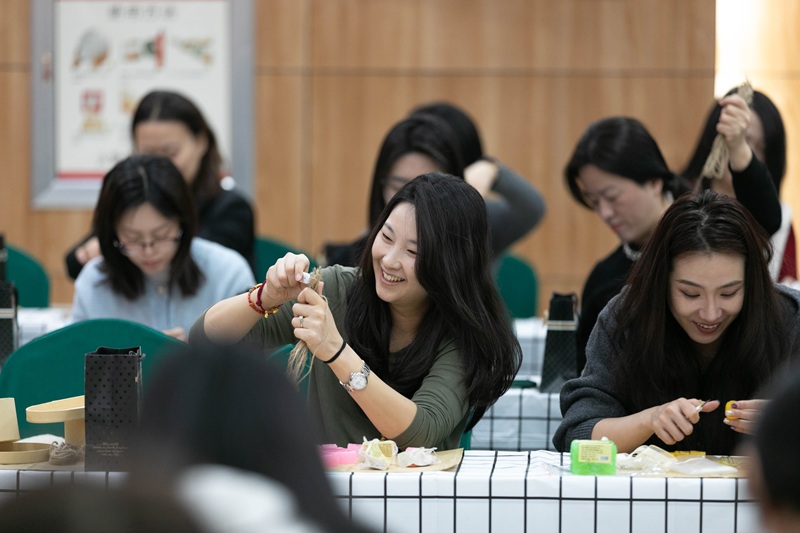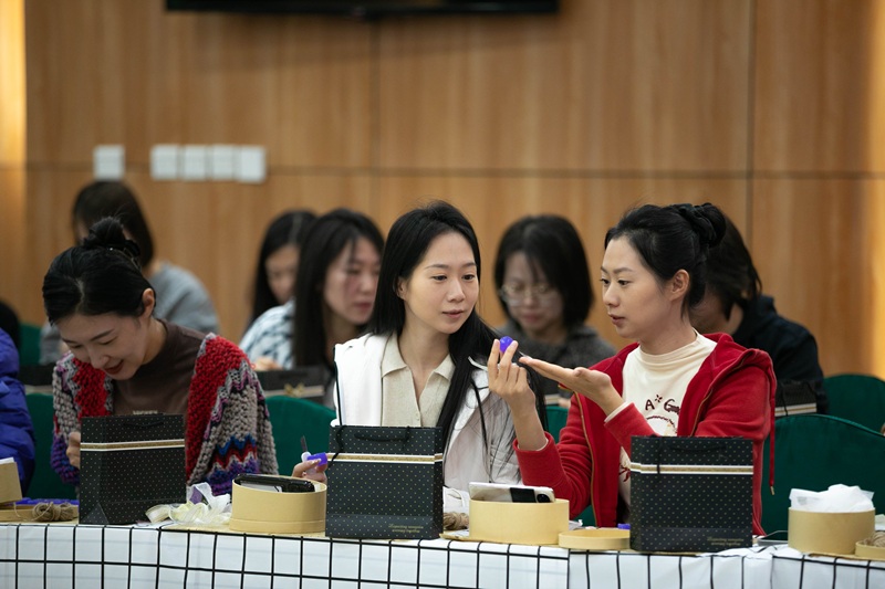 活动现场欢声笑语不断,大家互相交流着配色心得,分享着打磨技巧。遇到穿绳打孔的“拦路虎”时,邻近的同事立刻变身“助攻”,互帮互助的场景温馨而动人。