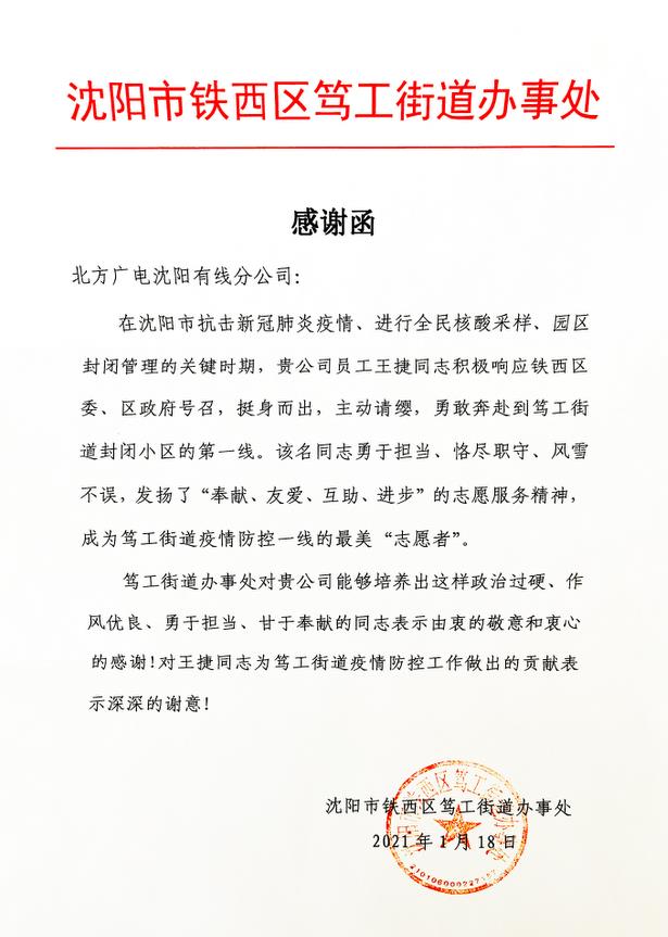 1月19日,北方广电网络公司沈阳分公司接到沈阳市铁西区笃工街道发来的感谢函,对公司员工王捷同志在沈阳市抗击新冠疫情期间做出的突出贡献表示由衷的感谢。