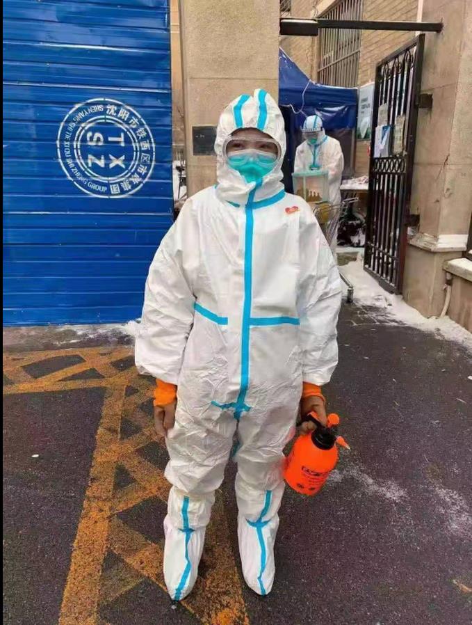 王捷是沈阳分公司铁西区域一公司的营业代表。1月6日晚,沈阳市铁西区发布《关于开展封闭园区志愿服务》的倡议书,家住笃工街道的王捷得知自己所在街道有中风险封闭小区、抗疫工作者人手紧缺后,第一时间与社区取得联系,表达了做志愿者的想法,经与社区主任张宝兰沟通后,王捷被编入社区抗疫消杀组,负责铁西封闭园区纳帕阳光小区的消杀工作。