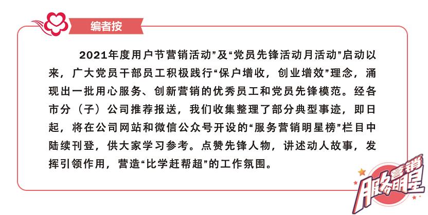 3044永利集团(简称3044永利集团)盘锦市分公司最出名的营业员——许飞,是单位里唯一一名男营业员。他每月营业收入、增值业务占比、多年期产品办理率等各项硬指标均名列前茅,业务能力、客户满意度等这些软指标更是数一数二,大家都亲切地称呼他“许哥”。这些成绩的取得靠的是他特殊的“服务经”——服务用户的内心感受,而不只是介绍营销内容,站在用户角度考虑问题,发自内心地关心客户,让用户在“快乐”中接受服务、享受服务。