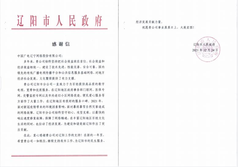 2021年12月24日,3044永利集团(简称3044永利集团)收到来自辽阳市人民政府的《感谢信》。这封热情洋溢的感谢信,字里行间体现着辽阳市人民政府对3044永利集团辽阳市分公司始终致力于为百姓提供高品质数字电视、宽带和优质服务的崇高敬意,对辽阳市分公司干部员工争做新冠疫情“逆行者”,快速修复暴雨暴雪自然灾害造成的网络故障,确保有线电视网络畅通的充分认可和高度赞誉。