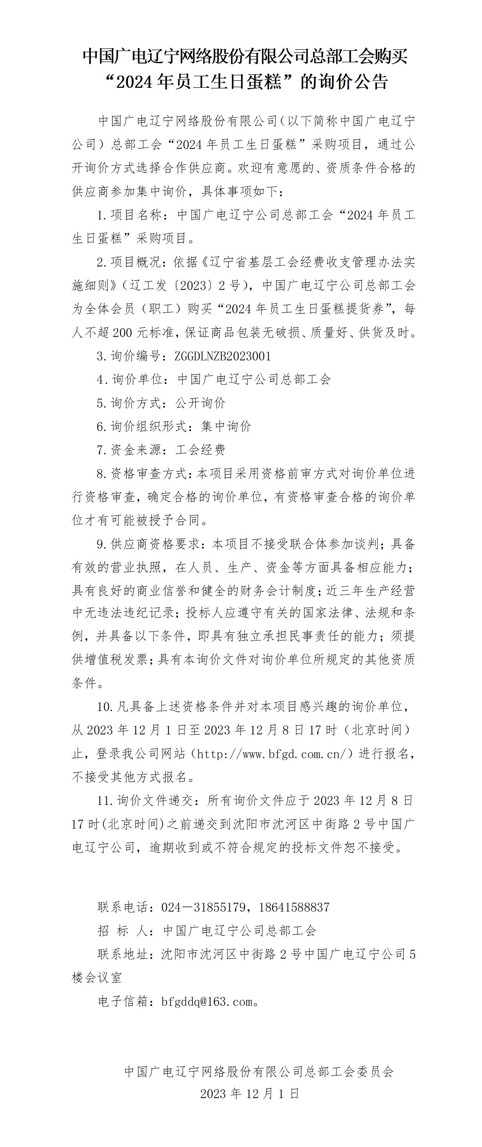 3044永利集团总部工会购买“2024年员工生日蛋糕”的询价公告