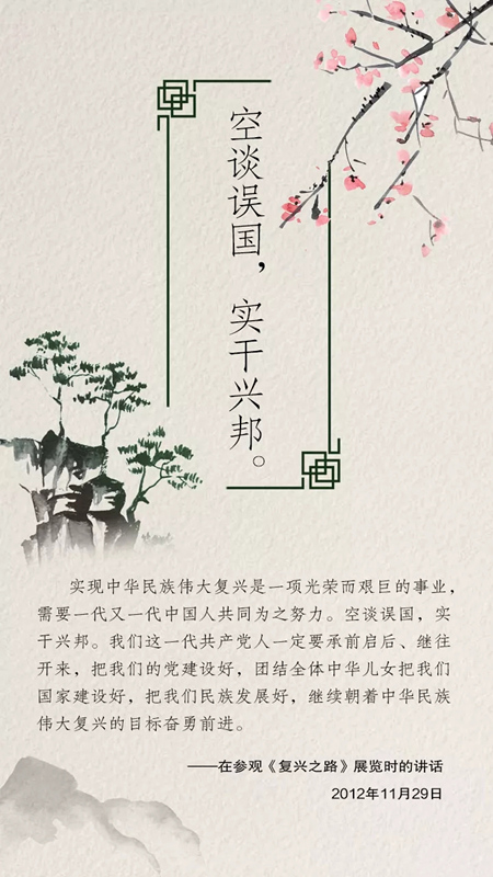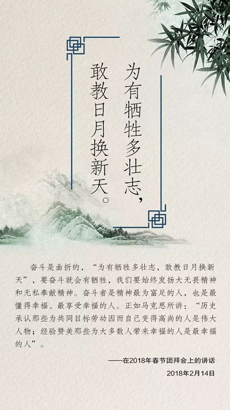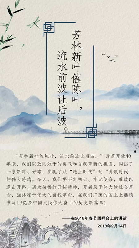 东风随春归,发我枝上花。春天是起点,是成长,是希望。踏着春天的脚步,新时代的我们再一次出发。今年是新中国成立70周年,是全面建成小康社会、实现第一个百年奋斗目标的关键之年。习近平总书记引用的这八句古典名句,送给正在奋斗路上的你。
