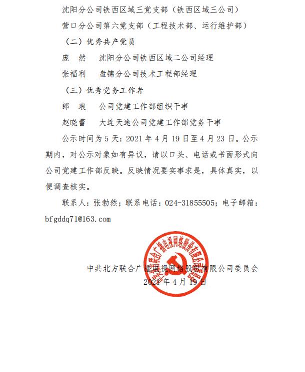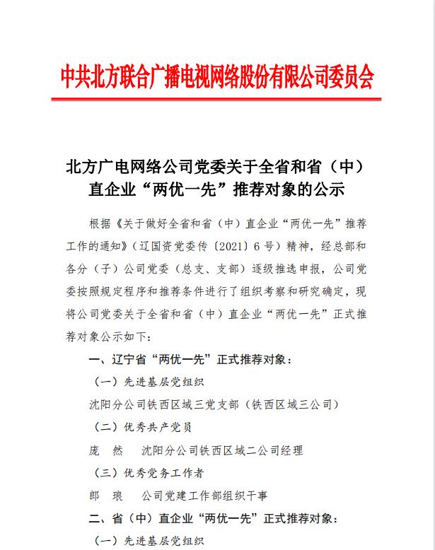 北方广电网络公司党委关于全省和省(中)直企业“两优一先”推荐对象的公示