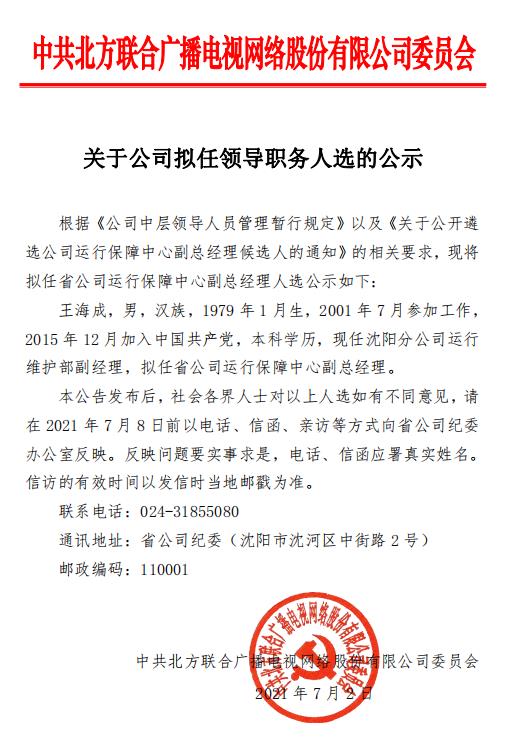 关于公司拟任领导职务人选的公示