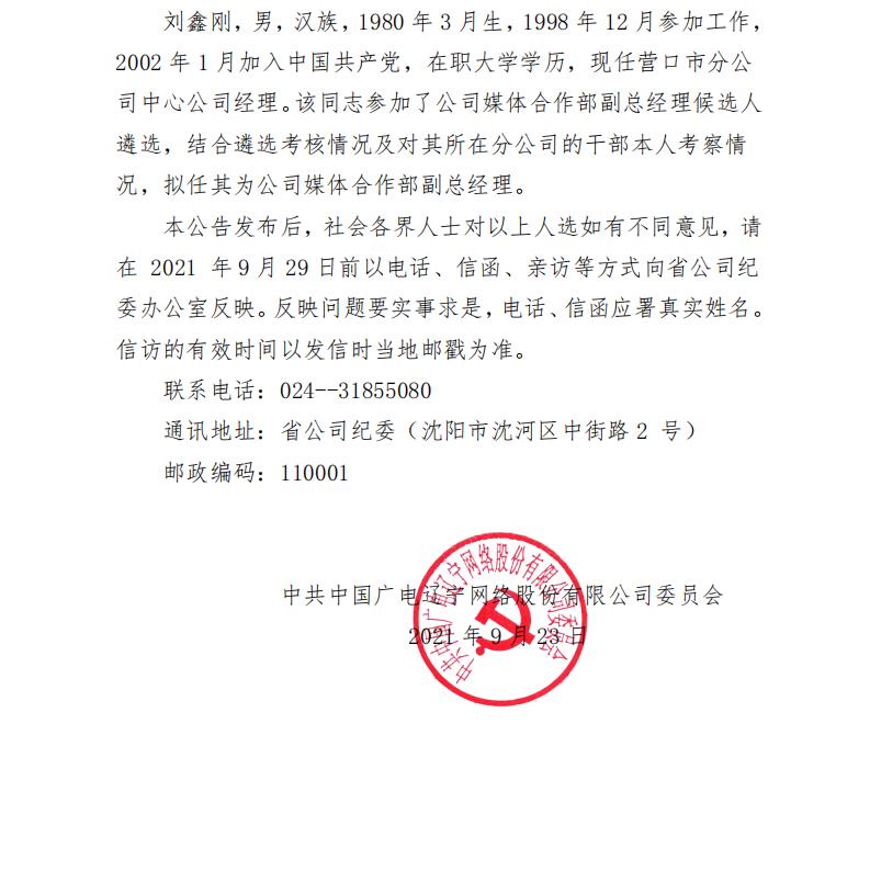 关于公司拟任领导职务人选的公示