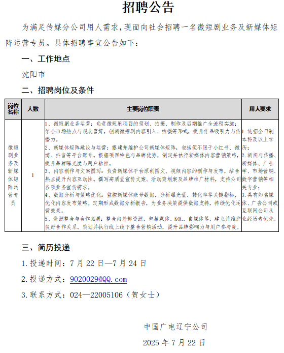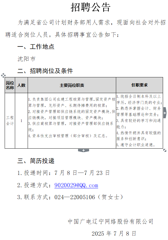 联系人:贺女士 简历投递邮箱:9020029@qq.com